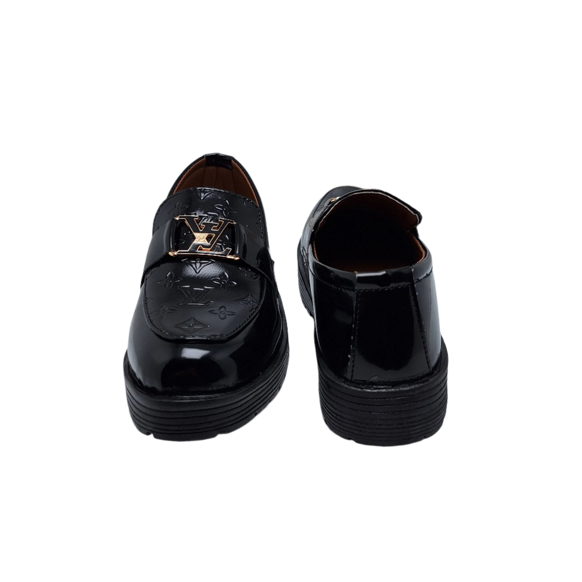 Elevate your style with the bold and distinctive Elite Loafers. These polished black loafers boast an embossed monogram pattern across the vamp, exuding high-end luxury. The centerpiece is a metallic “LV” buckle that adds a modern, fashionable flair. The shoes are constructed with a cushioned interior and durable sole, offering both comfort and long-lasting wear. Perfect for upscale events or adding a luxurious finish to everyday outfits, these loafers make a statement wherever you go.