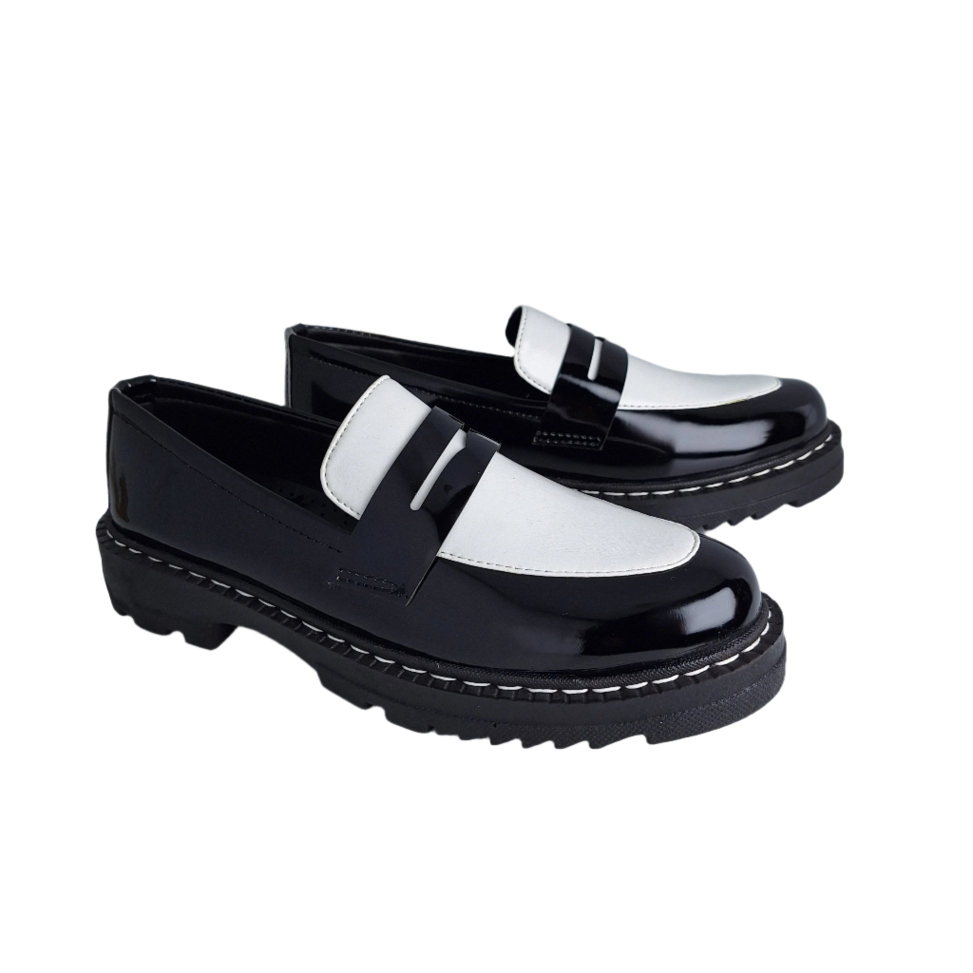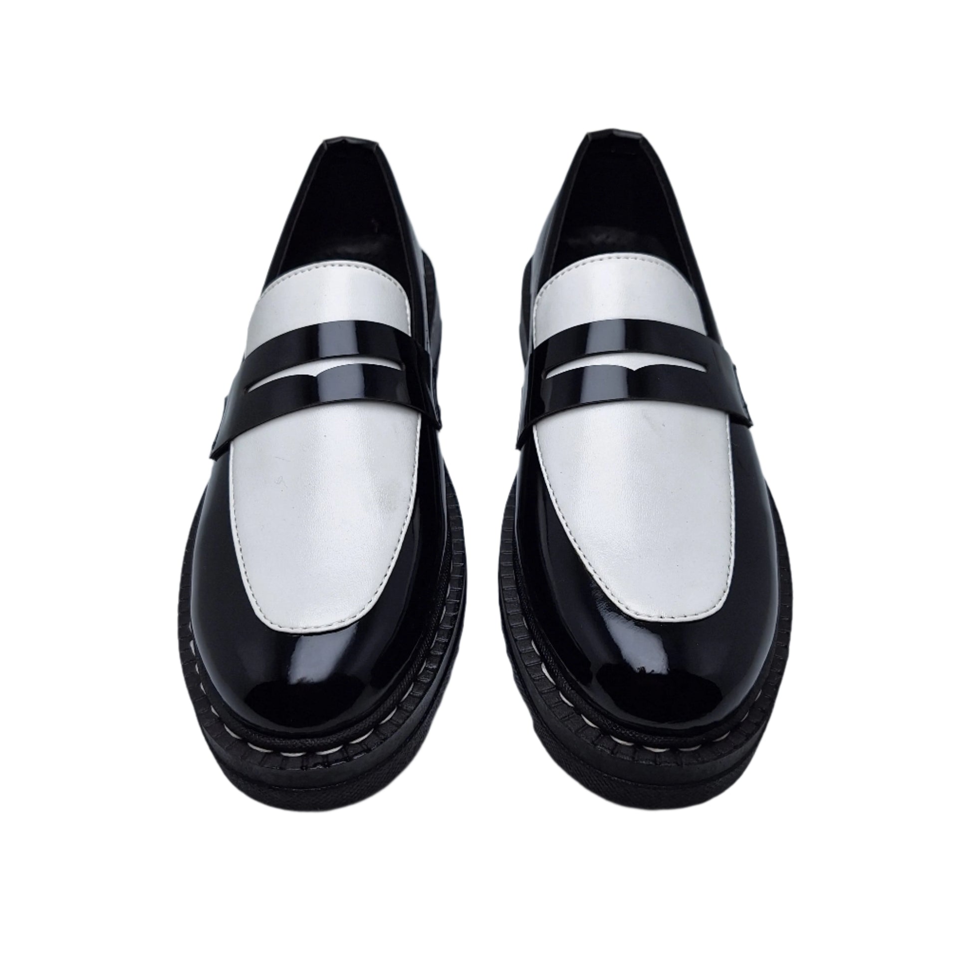 Command attention with the Monarch Dual-Tone Loafers – a timeless fusion of bold elegance and modern craftsmanship. Featuring a glossy black patent finish paired with a crisp white vamp, these statement loafers are designed for those who dare to stand out. The chunky lug sole ensures all-day comfort and grip, while the contrast stitching adds a refined edge. Whether you're dressing up for a formal event or elevating your everyday style, this loafer effortlessly blends sophistication with street-smart attitude.